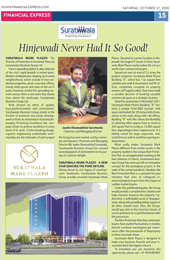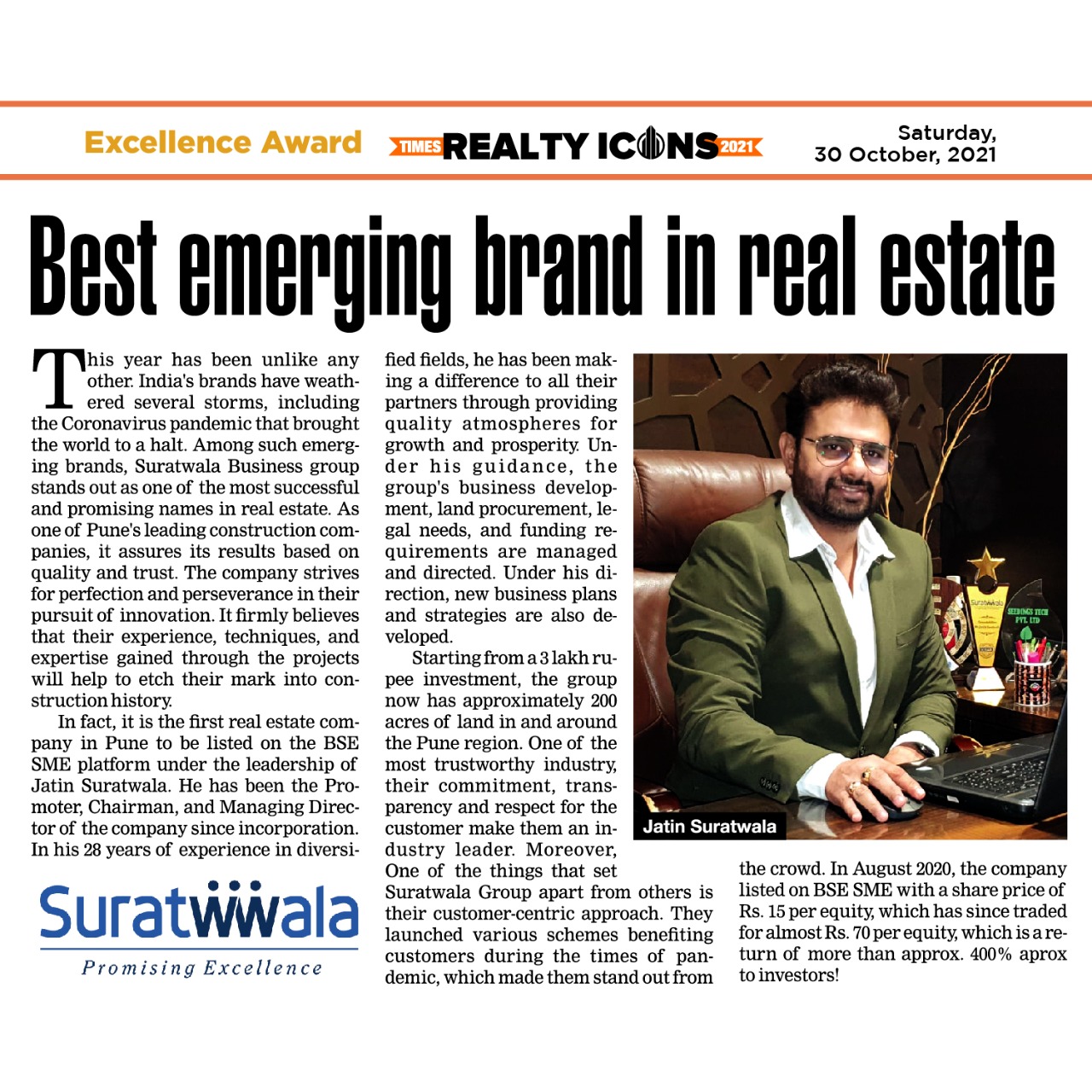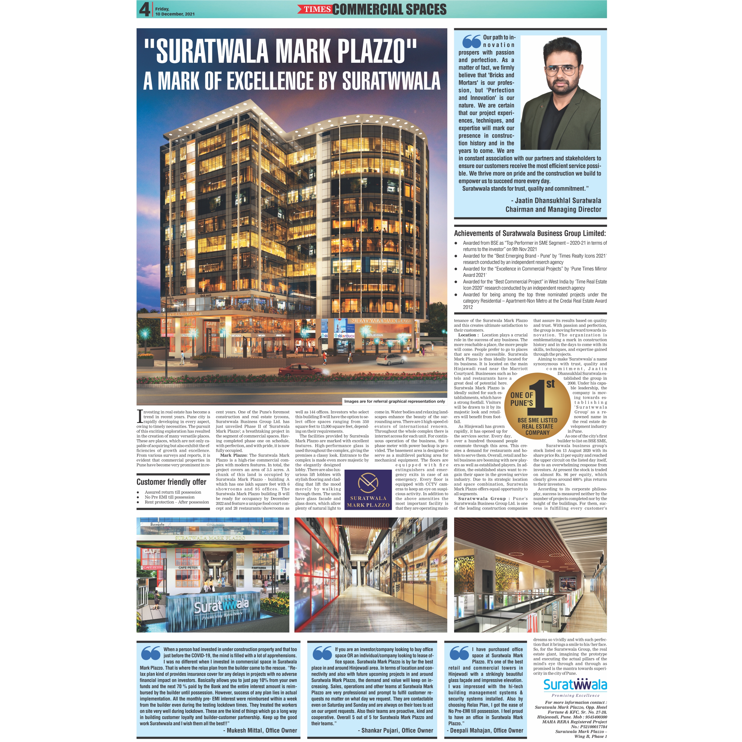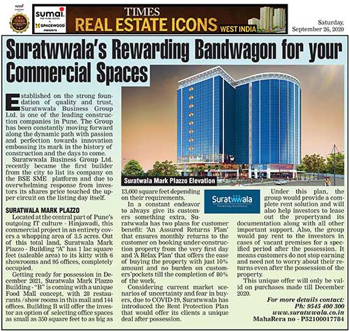 We are delighted to inform that the Suratwwala Business Group Limited has been featured in the Times Real Estate Icons - West India, in its issue dated 26th September, 2020. The Press coverage highlights theGroup`s business philosophy and achievements, with a focus on our latest commercial project - Suratwala Mark Plazzo - in Hinawadi, Pune.
