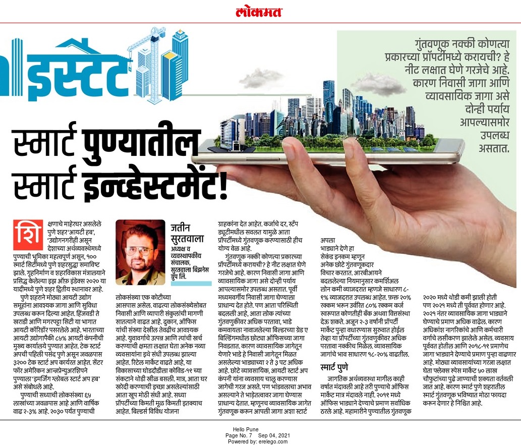 स्मार्ट सिटी पुणे, स्मार्ट गुंतवणुकीसाठी खरंच 'स्मार्ट' पर्याय आहे. पुण्यात उत्तम संधी निर्माण करून आपल्या मनाजोगे लक्ष साधण्यासाठी बराच वाव आहे. असे असूनही, व्यावसायिक किंवा निवासी मालमत्तांमधून योग्य मालमत्ता निवडणे, हे एक कठीण काम आहे. गुंतवणूक नेमकी आणि योग्य प्रकारे कशी करता येईल याबद्दल अधिक जाणून घेण्यासाठी, SURATWWALA BUSINESS GROUP चे, अध्यक्ष, व्यवस्थापकीय संचालक श्री. जतीन सुरतवाला, यांचा लोकमतमध्ये 04/09/2021 रोजी प्रकाशित झालेला, हा संपूर्ण लेख वाचा.