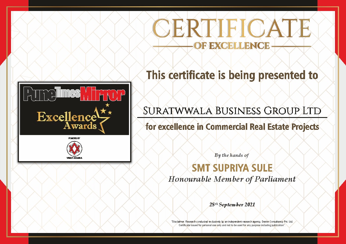 Suratwwala Business Group Ltd. has been honoured with the ‘Pune Times Mirror Award for Excellence in Commercial Real Estate Projects’. Chairman and MD, Mr. Jatin Suratwala, received the prestigious Award at the hands of Mrs. Supriya Sule, Hon. Member of Parliament. The Award symbolizes a major milestone in the company’s journey under the visionary leadership of Mr. Jatin Suratwala. The team at Suratwwala Business Group indeed feels happy and proud of this stellar achievement!