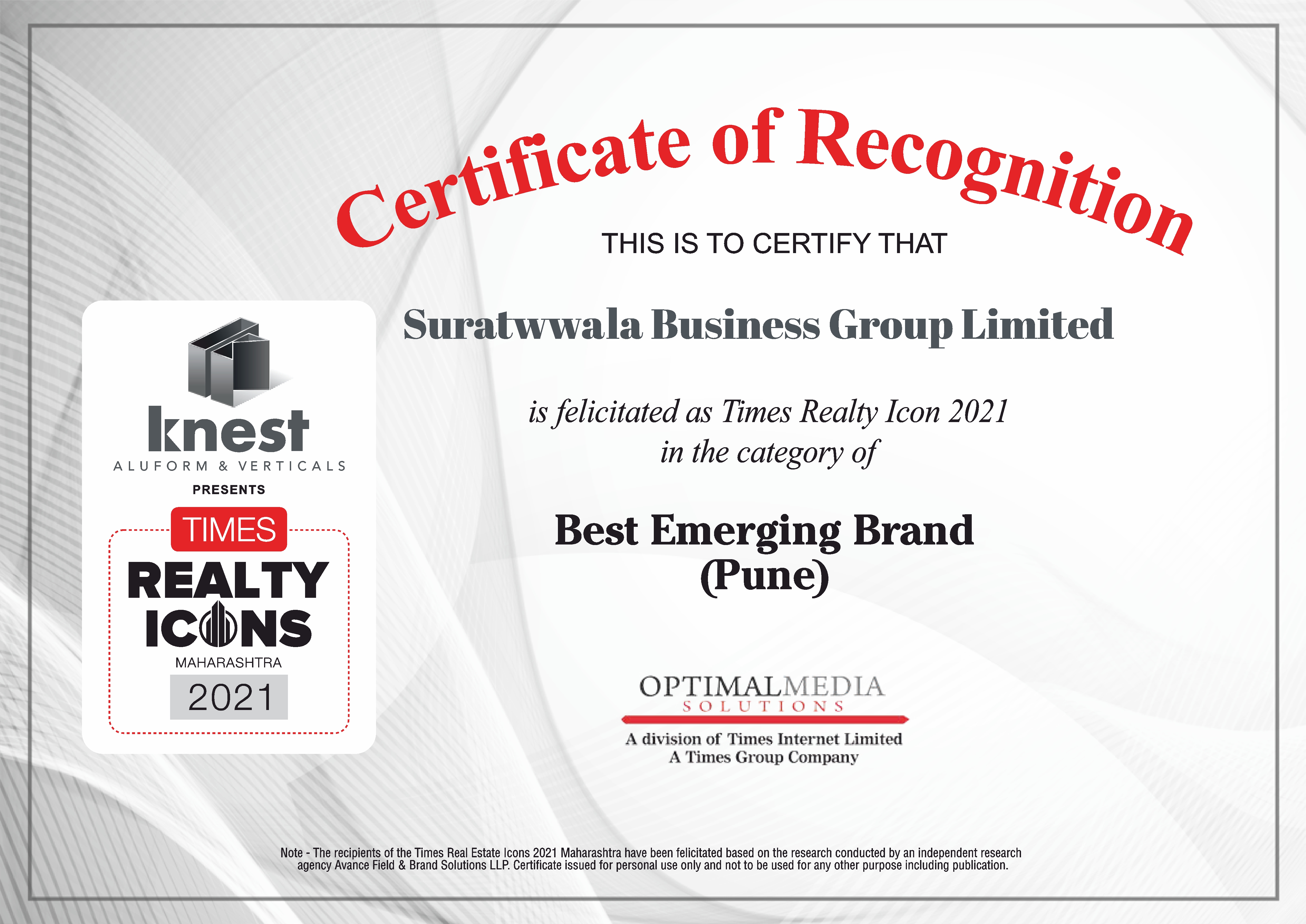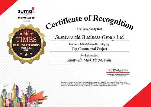 We feel happy to share that Suratwwala Business Group Ltd. has been facilitated with the Certificate of Recognition by 'TIMES REAL ESTATE ICONS - West India 2020' for our project Suratwala Mark Plazzo in the Top Commercial Project category. This is truly a great honor and a proud moment for our entire team!
