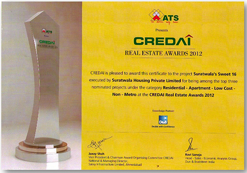 We feel happy to share that Suratwwala Housing Pvt Ltd. has been facilitated with the Certificate of Recognition by 'CREDAI REAL ESTATE AWARD 2012' for our project Suratwala Sweet 16 for being among the top three nominated project under the category RESIDENTIAL - APARTMENT - Low cost - Non - Metro. This is truly a great honor and a proud moment for our entire team!