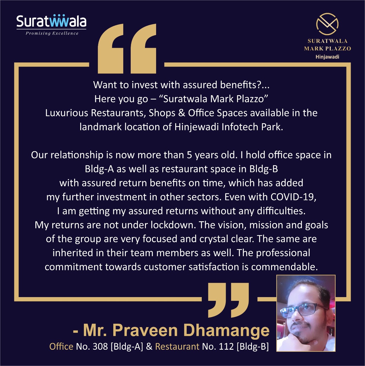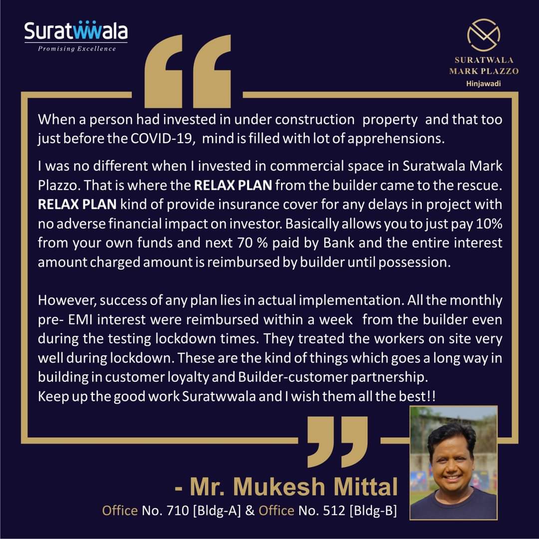 Hinjawadi, the central part of Pune’s outgrowing IT culture, is home to not just the ITs but to everything like modern residential layouts, premium restaurants and hi-tech commercial establishments. The infrastructure of this IT Hub is heading in a new direction. To step up this transformation, Suratwwala Business Group Ltd is coming with its brand new second phase of the Suratwala Mark Plazzo project. The first phase has been completed with perfection, delivered on time and is fully occupied with pride. The plazzo has lavish, assimilated spaces for offices, restaurants, and showrooms. All in one place with a supreme locality. Your super large quaint showrooms or cosy working place, all are equipped with complete modern amenities. We have commercial spaces for your every requirement. Grab the chance to build your impression at the Western Part of Pune. Enlarge your business with Suratwala Mark Plazzo and let destiny take its flow.